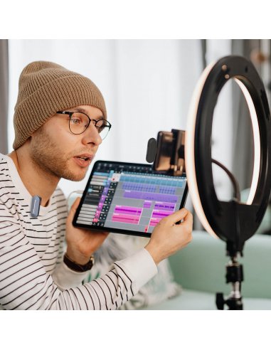 The dynamic light strip, namely Monster Halo that is unique to SYNCO, flashes on the front of the separate transmitter and receiver to tell you the condenser microphone for iPhone® or Android is working. This is an enhancement of the audio experience. It also shows on the charging case to indicate the battery life.